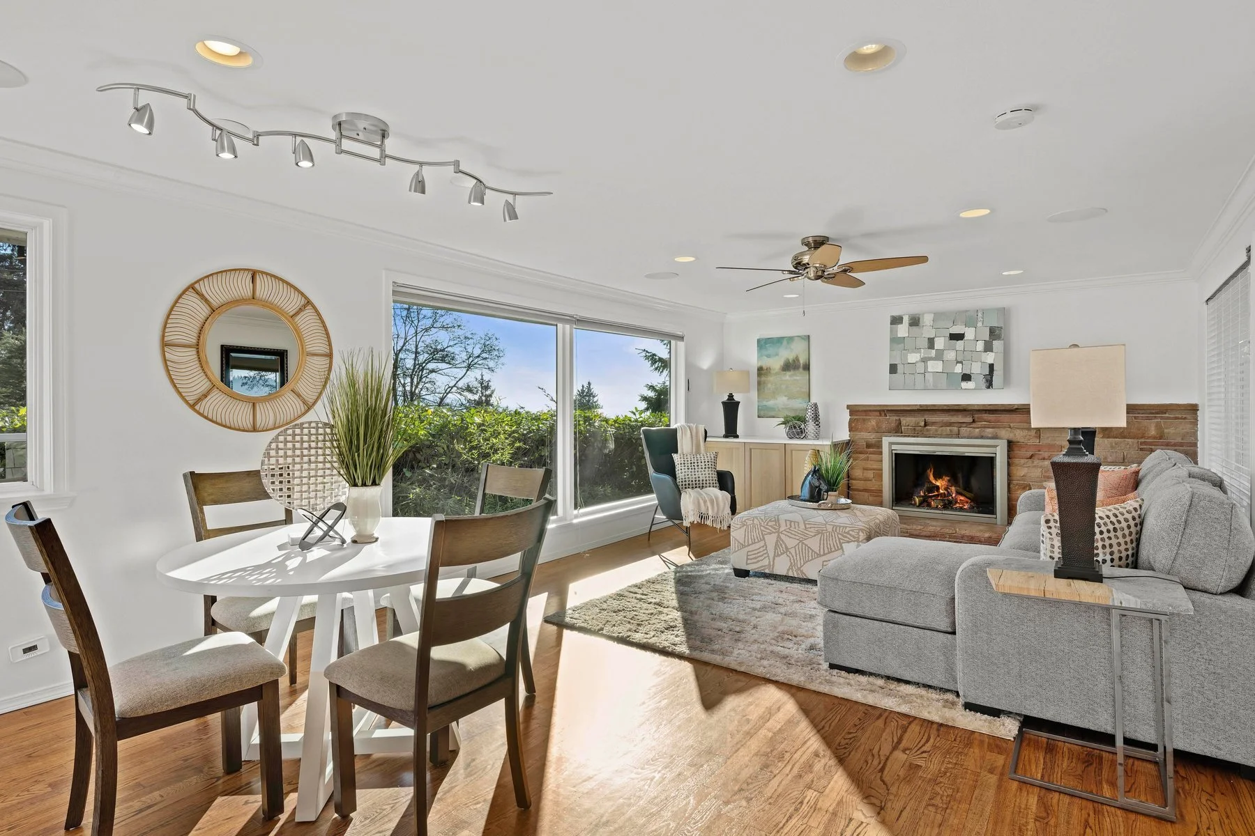 Turnkey Lake Forest Park property featuring two separate living spaces with Lake Washington and Mount Rainier views. The main level offers 3 bedrooms, 2 baths, refinished hardwood floors, crown molding, fresh interior paint, large view windows, and a well-designed kitchen with generous storage and added task lighting. Southeast-facing orientation brings natural light throughout the primary living areas. The lower level functions as a separate 2-bedroom, 1-bath ADU-style residence with its own full kitchen, private exterior entrance, living area, and dedicated space—ideal for rental income, multigenerational living, extended guests, or home office use. Flexible layout supports owner-occupancy with income potential or dual-living arrangements. Permitted and inspected electrical upgrades include panel improvements, separated grounds/neutral in the sub-panel, updated water-heater wiring, grounded dryer outlet, improved garage electrical, new outlets (including deck outlets), added lighting, and an outlet for future smart water-shutoff valve. Tech features include hardwired Wi-Fi access points, hardwired ethernet, in-ceiling speakers, security cameras, doorbell camera, and pull-down TV mount with HDMI and speaker wiring. Outdoor upgrades include aluminum-and-glass deck railing, raised garden beds, and wide driveway. Convenient access to I-5, I-405, Hwy 522, transit, and light rail. Video tour and drone photos available.